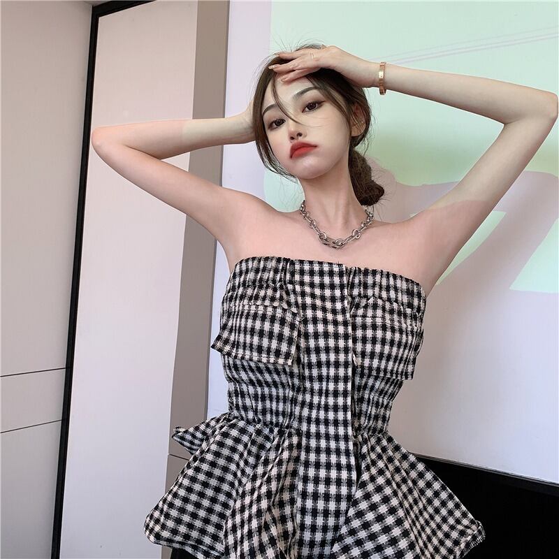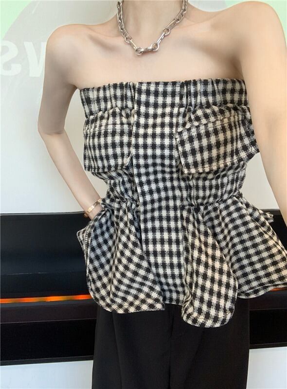 全1色 ノースリーブトップス フリル チューブトップ バックオープン オフショルダー チェック柄
