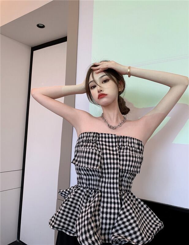 《最新作オススメ》ノースリーブトップス フリル チューブトップ バックオープン オフショルダー チェック柄 sweet系