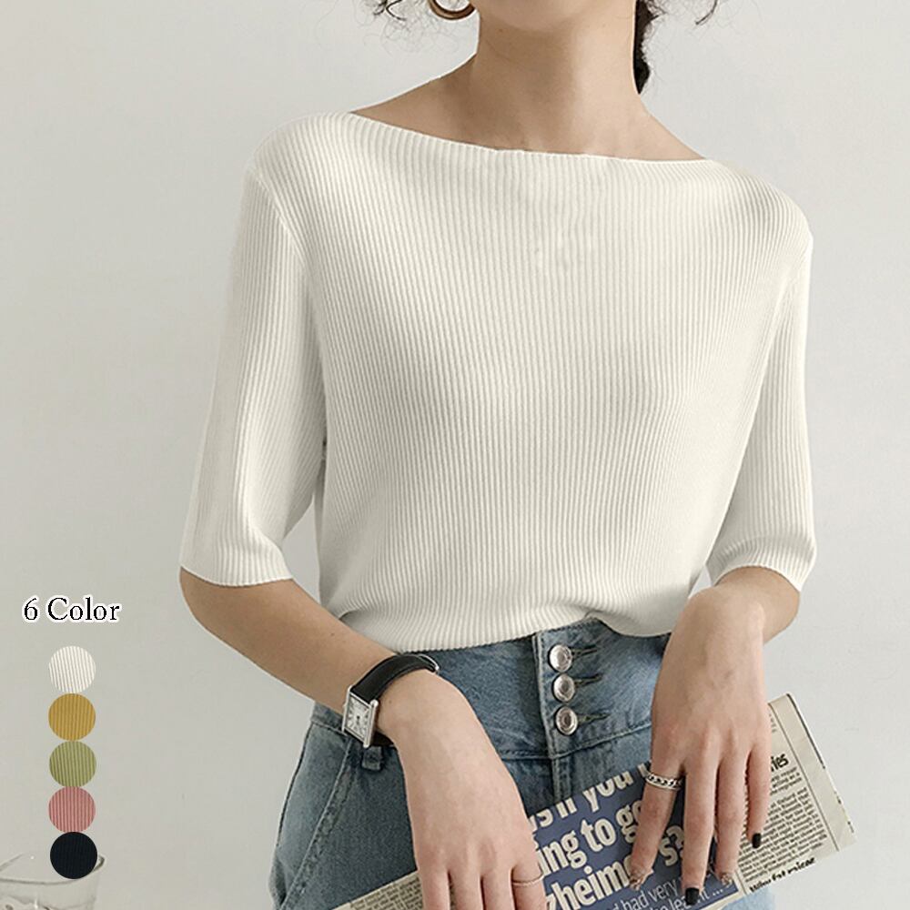 ニットトップス ボートネック ニットソー 無地 プルオーバー シンプル 薄手 リブニット 無地 ニットソー 着やせ トップス