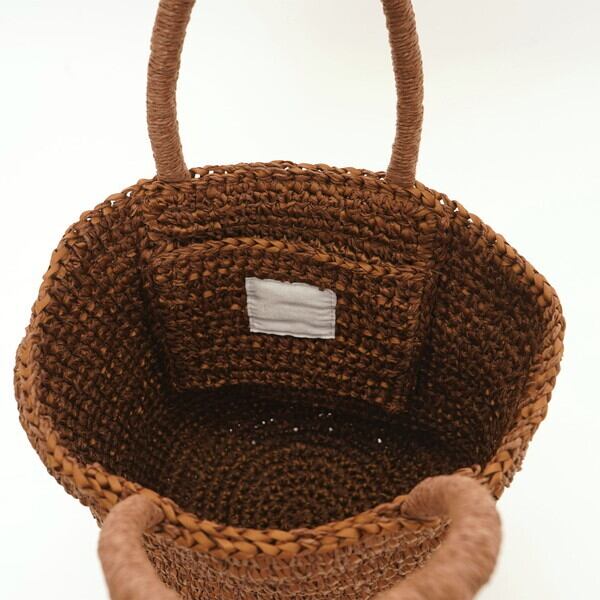 ボディはサテンリボンとペーパーヤーンをミックスして手作業で編みたてた丸いフォルム。