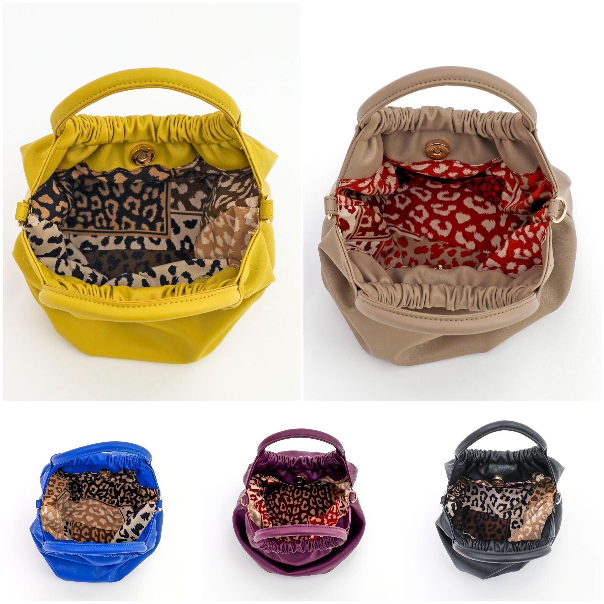 口元にギャザーを施し、まるいデザインにフィットしたハンドルで持つこともできて、