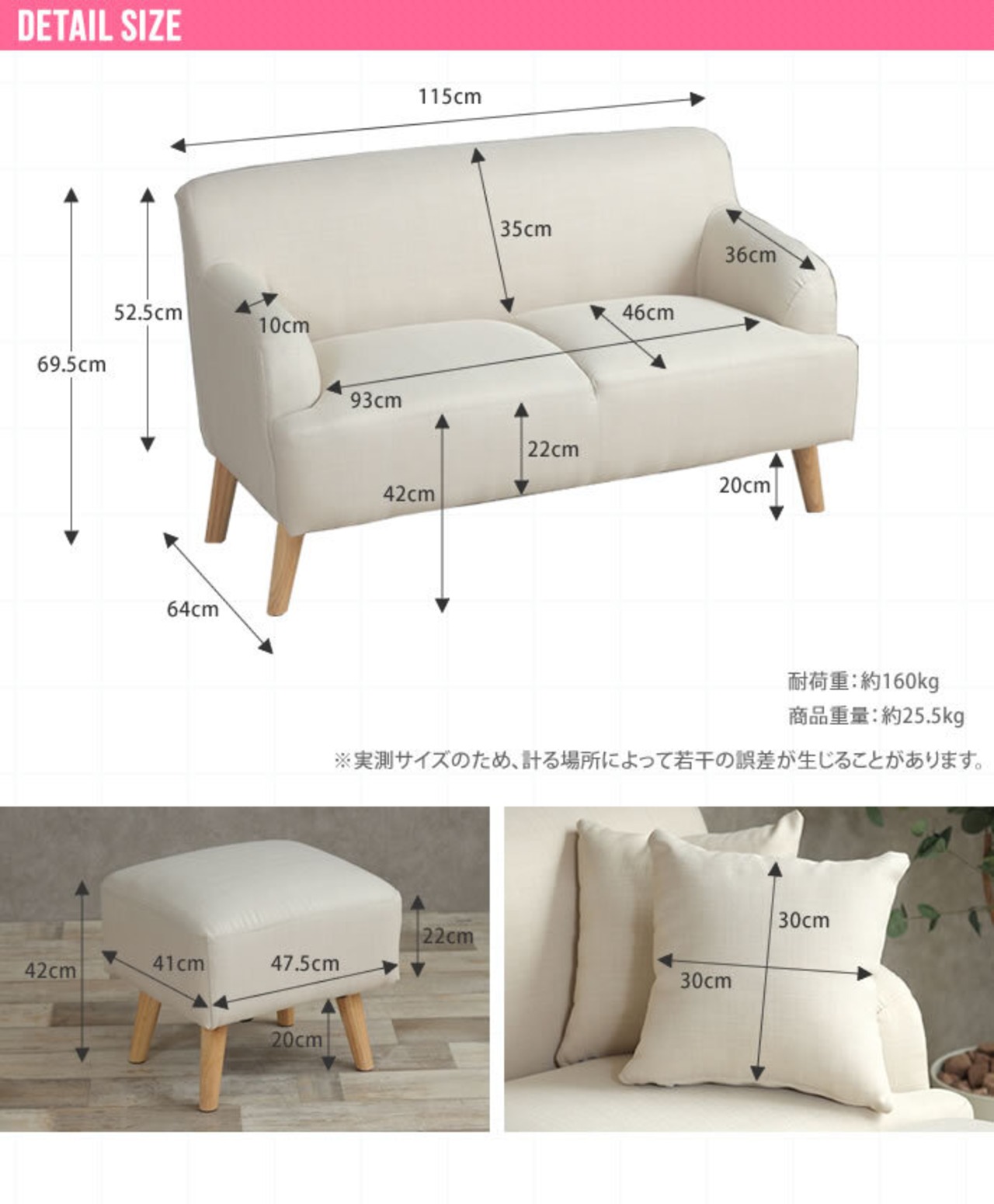 2Pソファ:幅115cm×奥行64cm×高さ69.5cm(座面高:42cm)