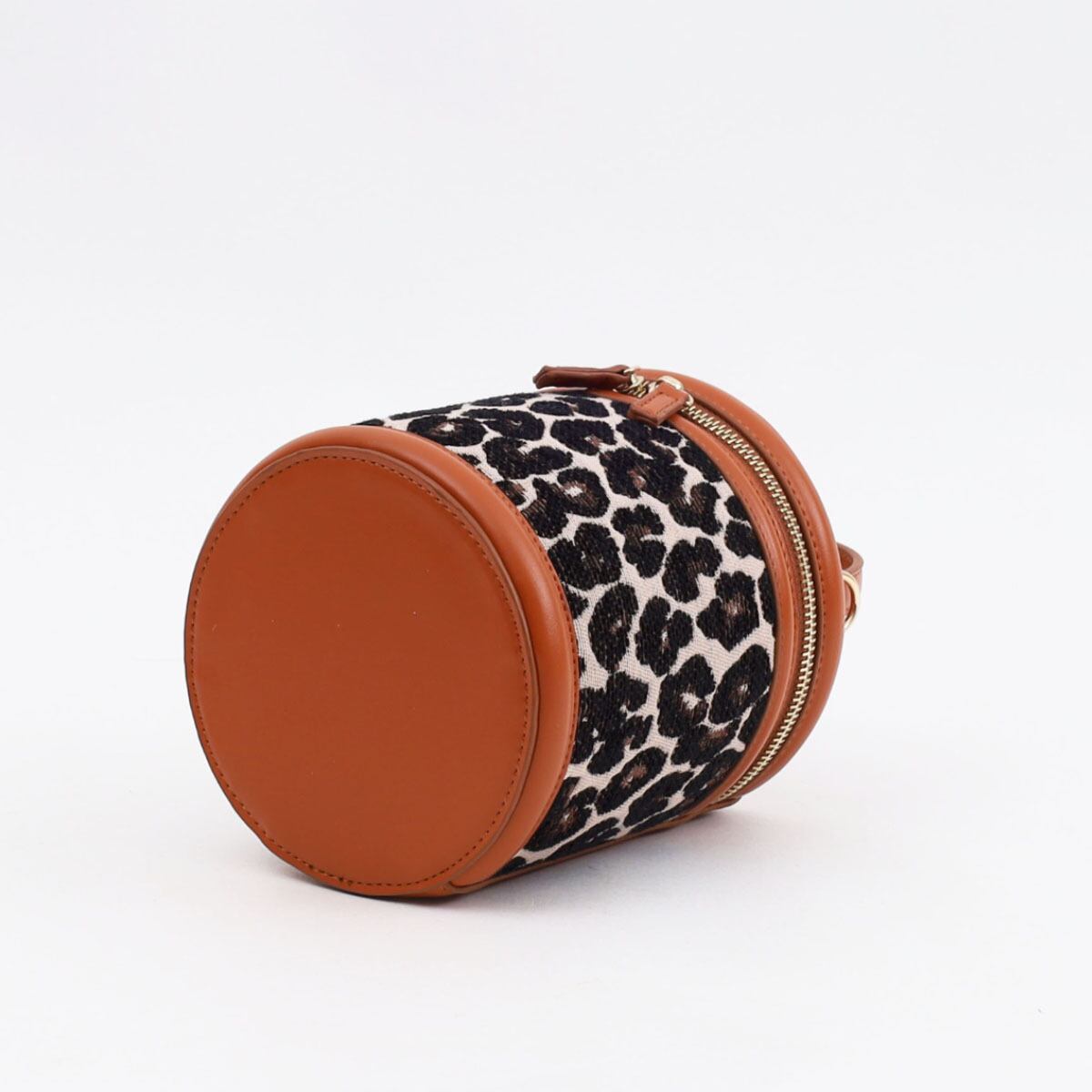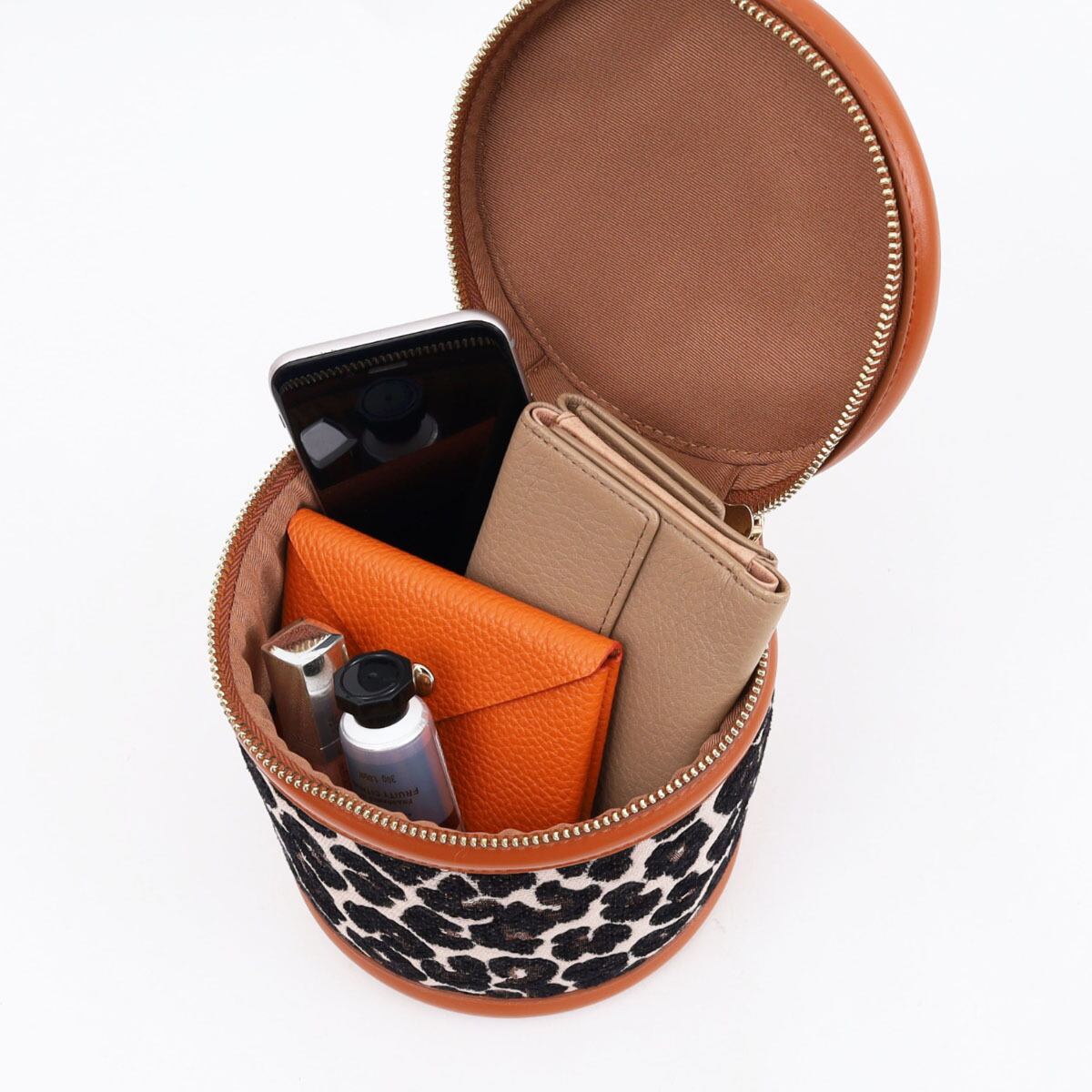 高級感あるヒョウ柄のジャカード生地を使用した筒型バニティバッグ!